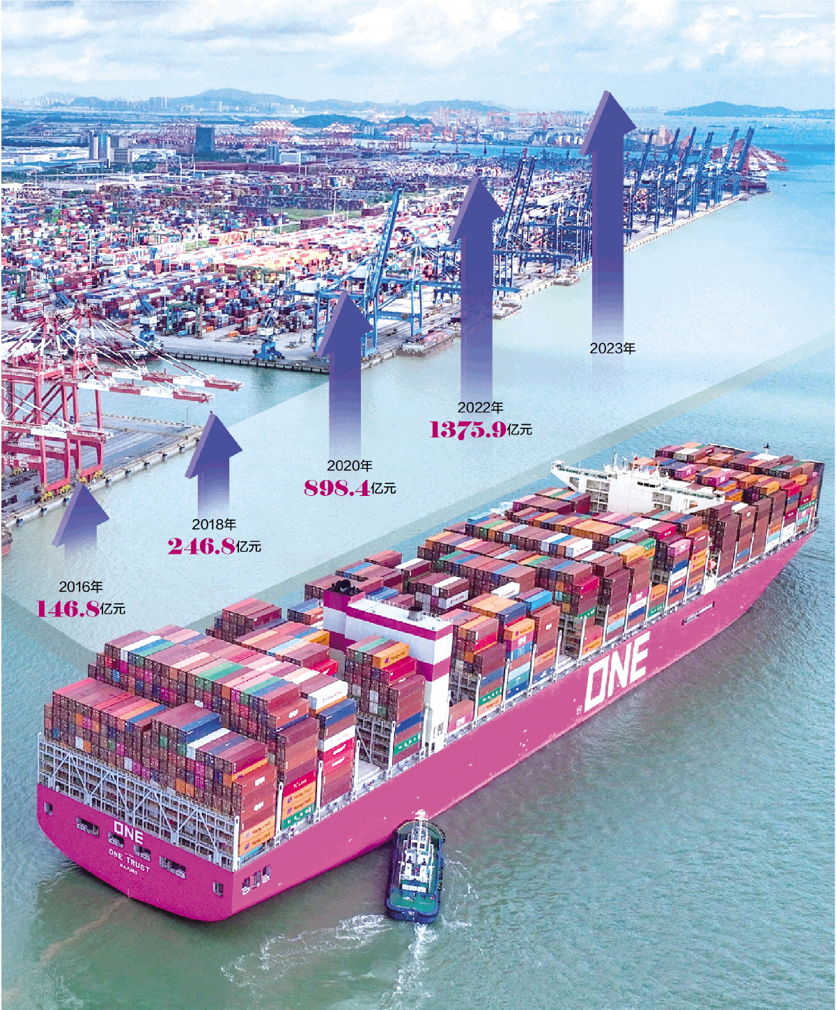 满载集装箱的轮船驶出广州南沙港集装箱码头。12月5日,2023跨境电商大会在广州举办。自2016年以来,广州市跨境电商进出口规模8年增长93倍,进口规模连续9年位居全国第一。2022年,全市跨境电商进出口交易额首次突破千亿,今年截至目前已超1600亿元。 南都拍客 陈志强 摄