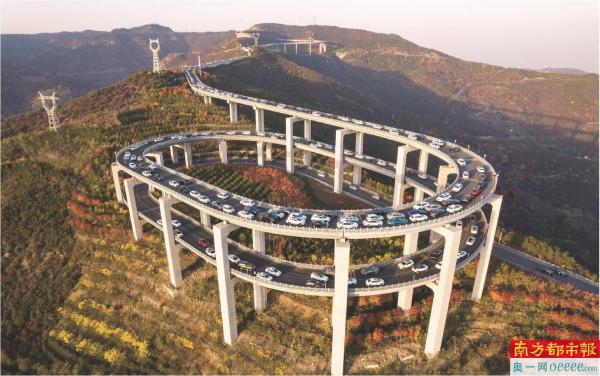 2022年10月,大批市民驱车前往山西太原天龙山赏秋,其中一段三层设计的回旋式高架“网红公路”吸引市民逗留打卡。 IC供图