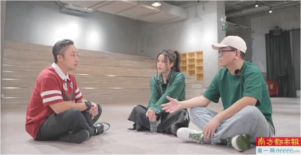 黄冕(左一)向李思雅SIYA和@清醒老C介绍大湾区街舞赛事的情况。