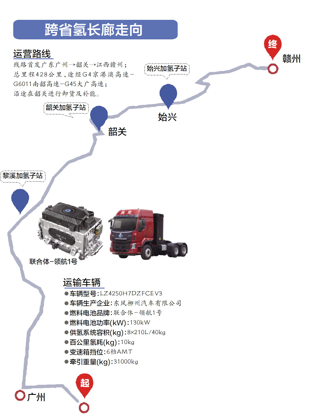 京广港澳高速首段粤赣(广东广州-韶关-江西赣州)跨省氢长廊由广东云韬氢能科技有限公司与宝武清洁能源有限公司共同筹备,属于粤赣省际氢能重卡物流运输示范线路。