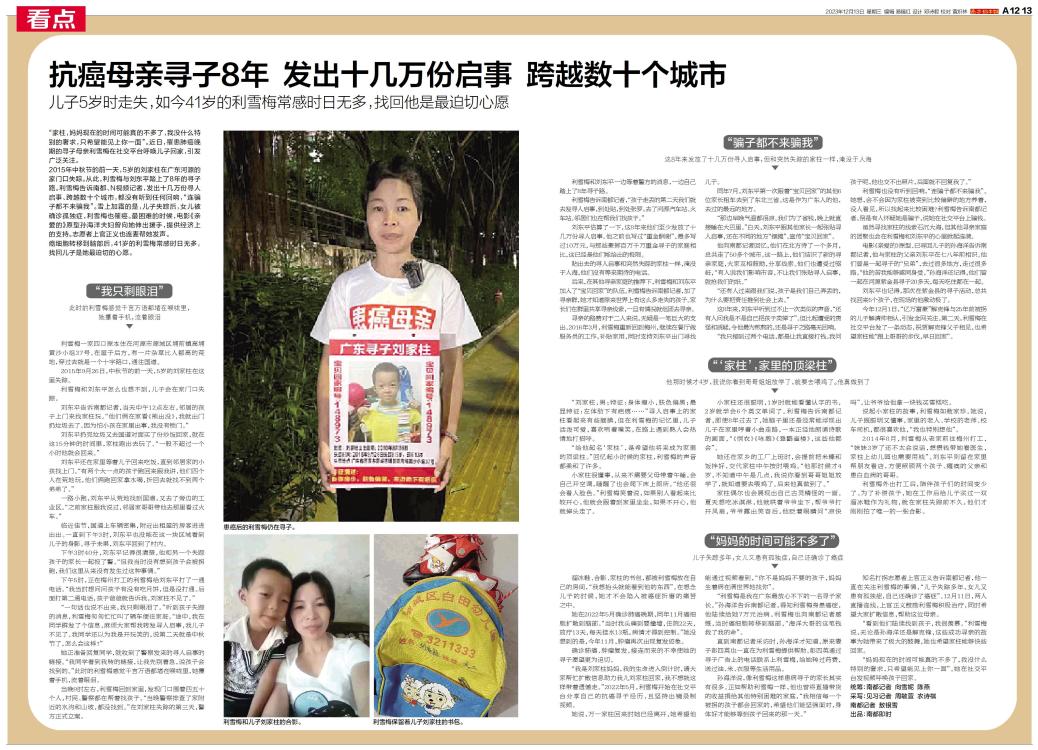 2015年中秋节的前一天,5岁的刘家柱在广东河源的家门口失踪。从此,利雪梅与刘东平踏上了8年的寻子路。利雪梅告诉南都、N视频记者,发出十几万份寻人启事、跨越数十个城市,都没有听到任何回响,“连骗子都不来骗我”。雪上加霜的是,儿子失踪后,女儿被确诊孤独症,利雪梅也罹癌。最困难的时候,电影《亲爱的》原型孙海洋夫妇曾向她伸出援手,提供经济上的支持。志愿者上官正义也连麦帮她发声。