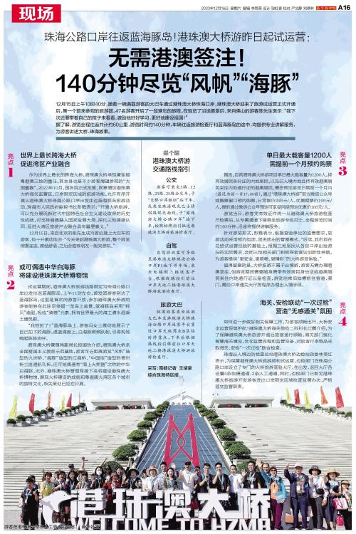 12月15日上午10时40分,随着一辆满载游客的大巴车通过港珠澳大桥珠海口岸,港珠澳大桥迎来了旅游试运营正式开通后,第一个前来参观的旅游团。