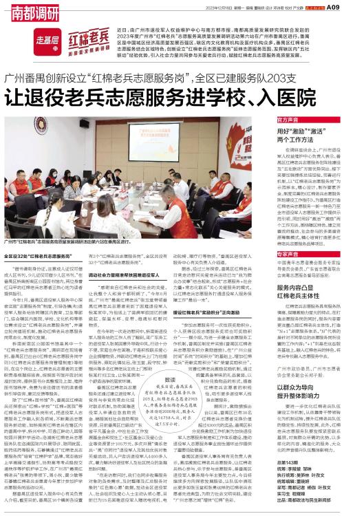近日,由广州市退役军人权益维护中心与南方都市报、南都高质量发展研究院联合发起的2023年度广州市“红棉老兵”志愿服务高质量发展调研活动第六站在广州市番禺区进行。