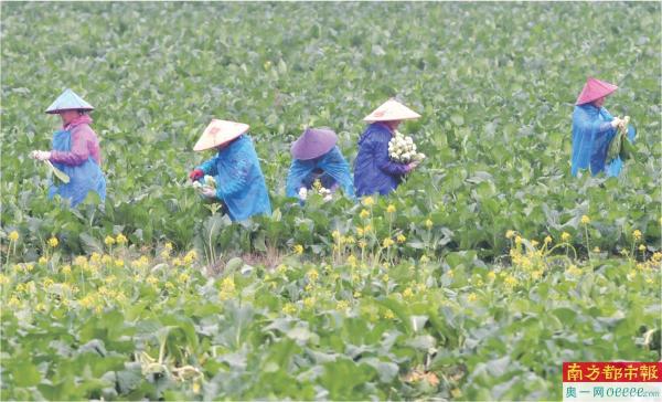 12月4日,西岸镇冲口村,农民戴着斗笠在雨中摘菜心。 南都拍客 骆志刚 摄