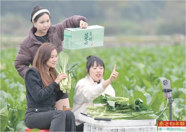 12月13日,西岸镇冲口村,主播展示包装好的连州菜心。近来年,连州菜心实现从“菜园子”直通“菜篮子”。 南都拍客 骆志刚 摄