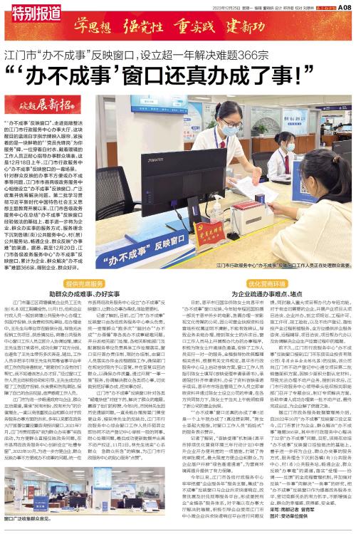 针对群众反映的办事不方便或办不成事等问题,江门市市县两级政务服务中心相继设立“办不成事”反映窗口,广泛收集并统筹解决问题。