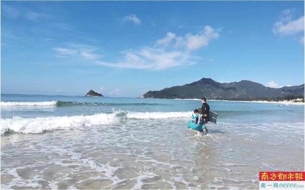 欧海洋带着儿子在深圳的海边玩冲浪。
