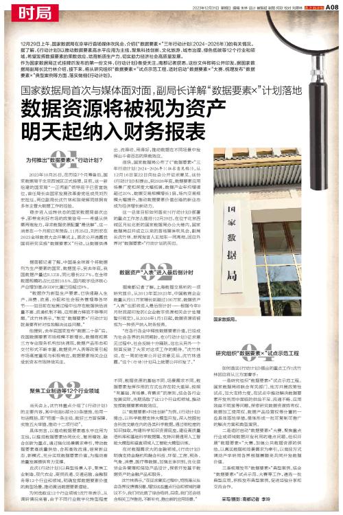 12月29日上午,国家数据局在京举行首场媒体吹风会,介绍《“数据要素×”三年行动计划(2024-2026年)》的有关情况。
