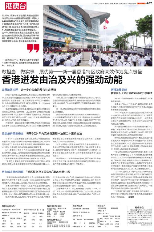国家安全防线不断强化,特区政府治理能力得到提升,香港高质量发展生机勃勃,市民幸福感稳步增强。