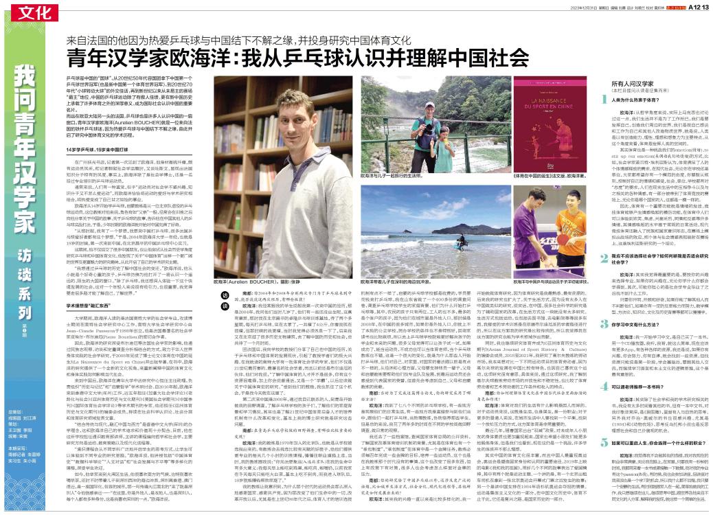 青年汉学家欧海洋(Aurelien BOUCHER)就是一位来自法国的铁杆乒乓球迷,因为热爱乒乓球与中国结下不解之缘,由此开启了研究中国体育文化的学术历程。