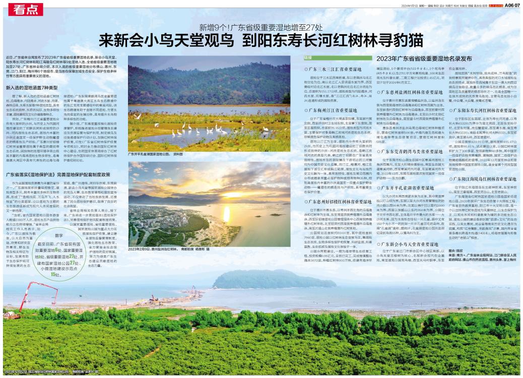 近日,广东省林业局发布了2023年广东省省级重要湿地名录,新会小鸟天堂、阳东寿长河红树林和阳江海陵岛红树林等9处湿地入选,全省省级重要湿地增加至27处。广东省林业局介绍,本次入选的省级重要湿地分布佛山、惠州、东莞、江门、阳江、梅州等6个地级市,是当地在保障区域生态安全、保护生物多样性等方面具有重要意义的湿地。