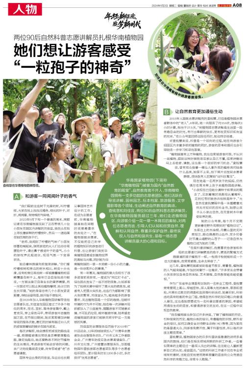 查钱慧和刘佳宜,两位90后自然科普志愿讲解员,在华南植物园服务超过三年,她们走进植物园区,向游客介绍一花一草一木背后的奥秘。对两位志愿者而言,引导人们认知和欣赏自然,理解和认同自然,尊重并保护自然,最终实现人与自然和谐共生,是每一场志愿讲解员最大的心愿和目标。