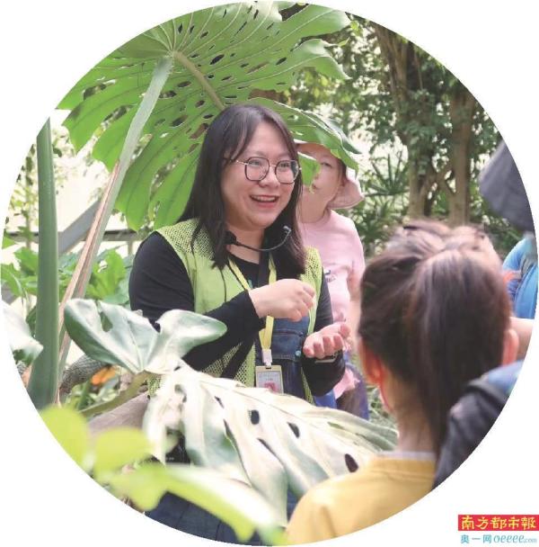 2023年9月下旬一个普通的周末,南都记者在华南植物园见到了正在带领几十位小朋友在园区内讲解的刘佳宜,她低头在地上寻找着新鲜的柠檬桉叶,然后一一递给围在她四周的孩子们。