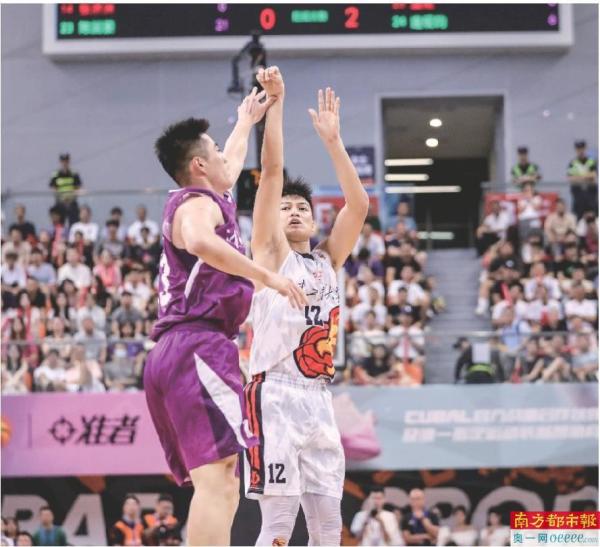 2. 2023年中国大学生篮球联赛(CUBAL)总决赛,周泽源(右)出手投篮。