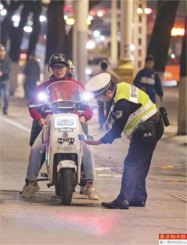 昨日,广州电动自行车限行新规开罚。傍晚,广州东风西路广雅校门口到西场立交段,交警查处电动自行车违规载人交通违法行为。 南都记者 黎湛均 摄