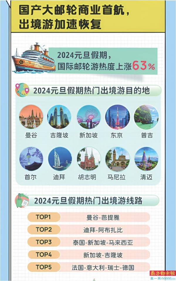 同程旅行数据显示2024年元旦假期最热门的出境游目的地为曼谷、吉隆坡、新加坡、东京、普吉、首尔、迪拜、胡志明市、马尼拉和清迈。其中,泰国占据三席。跟团游产品方面,泰国的曼谷-芭提雅6天至7天的旅游线路最为热门,其次为迪拜-阿布扎比7天左右的线路产品。