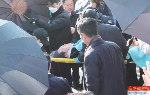 1月2日,在韩国釜山,韩国最大在野党党首李在明遭袭,在现场接受紧急处置后被送往医院救治。