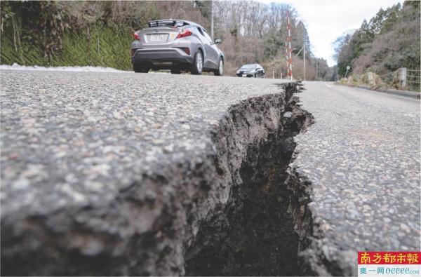1月2日,在日本石川县羽咋郡,道路被地震损坏。