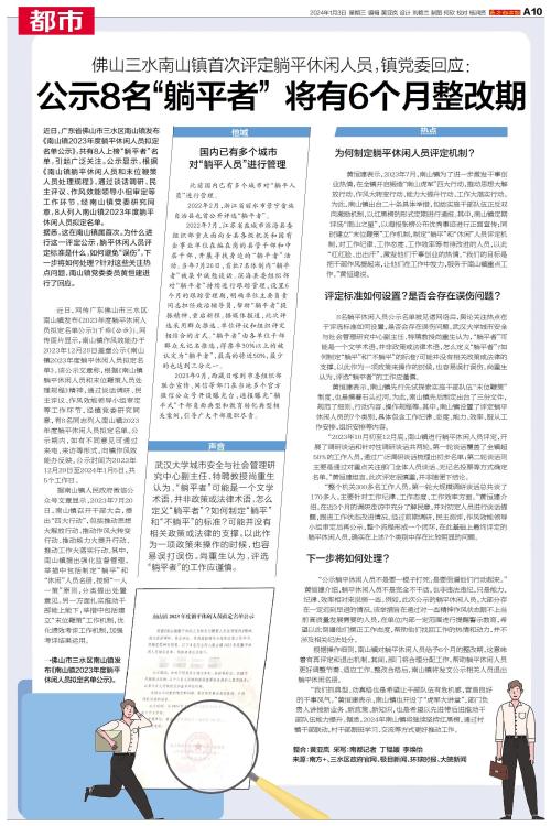 近日,广东省佛山市三水区南山镇发布《南山镇2023年度躺平休闲人员拟定名单公示》,共有8人上榜“躺平者”名单,引起广泛关注。
