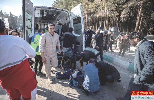 1月3日,在伊朗克尔曼市,医护人员在爆炸事故现场抢救伤员。