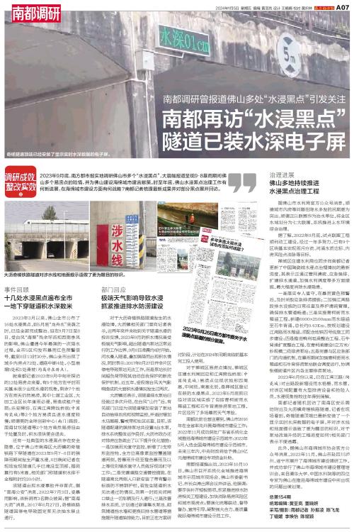 2023年9月底,南方都市报实地调研佛山市多个“水浸黑点”,大篇幅报道呈现9·8暴雨期间佛山多个易涝点的险情,并为佛山建设海绵城市建言献策。