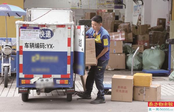 广州市越秀区,一快递员将货物搬上车。 南都记者 冯宙锋 摄