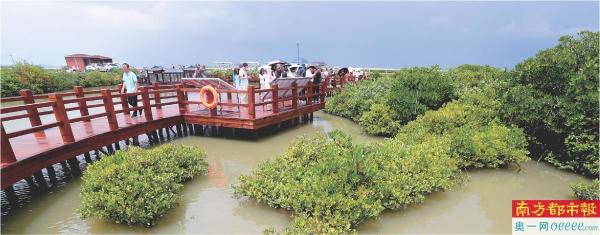 人们在湛江市麻章区金牛岛观赏红树林。 新华社发