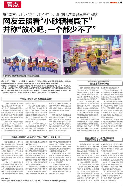 就在前几日,广西南宁一幼儿园里11个年龄均在3-6岁的小朋友由老师带队出发,勇闯哈尔滨游学。