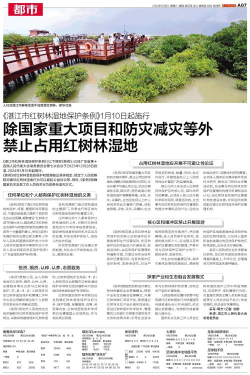 《湛江市红树林湿地保护条例》已经广东省第十四届人民代表大会常务委员会第七次会议于2023年12月28日批准,2024年1月10日起施行。