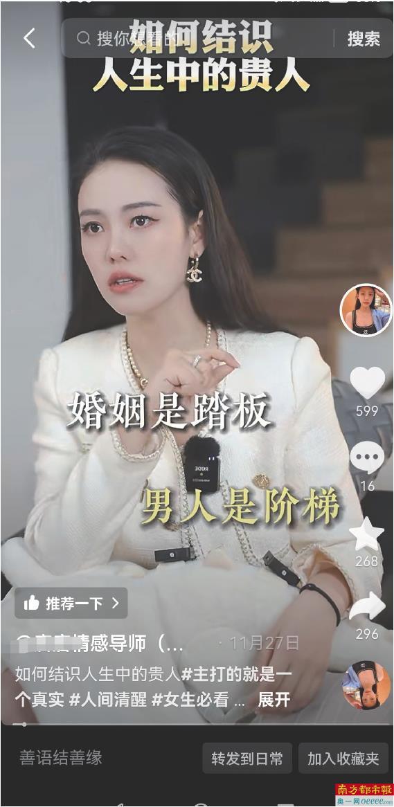 南都大数据研究院调查发现,有自媒体账号打着心理咨询、情感咨询的名头,通过直播连麦、授课短视频等形式不断输出“撒娇换来千万房产”“怎样拿捏男人”等价值观和言论,引导女性利用情感、婚姻等去获取金钱与资源,同时售卖情感课程、1V1咨询等服务。