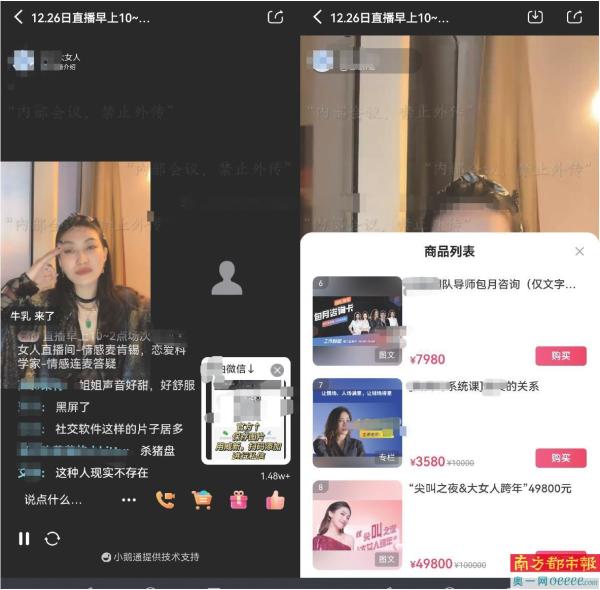 2023年12月26日,南都记者进入了“曲X”直播间,该主播正在给连麦粉丝分析情感问题,直播间的实时弹幕也在快速滚动。在连麦的间隙,其还会主动引导粉丝购买直播间内的1V1导师咨询、情感课程、闺蜜圈等服务,价格从数千元到数万元不等。该场直播结束后,直播间的点赞人数超过了7万人次。