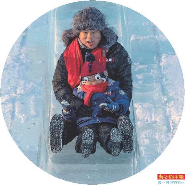 游客在哈尔滨冰雪大世界体验冰滑梯。