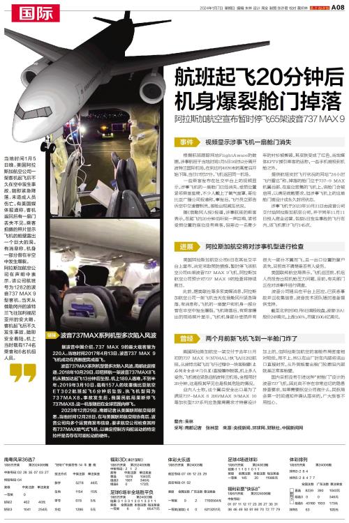 当地时间1月5日晚,美国阿拉斯加航空公司一架客机起飞后不久在空中发生事故,随即紧急降落,未造成人员伤亡。
