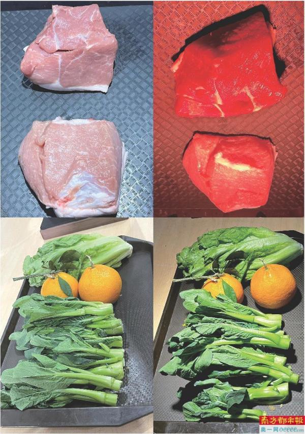 3. 自然灯光(左)与“生鲜灯”(右)照射下猪肉和蔬果的颜色对比。