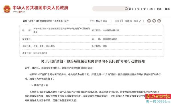 2. 2023年12月12日,中央网信办发布《关于开展“清朗·整治短视频信息内容导向不良问题”专项行动的通知》。