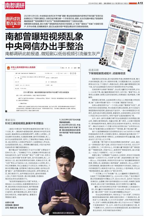2023年12月12日,中央网信办发布《关于开展“清朗·整治短视频信息内容导向不良问题”专项行动的通知》,自即日起开展为期一个月专项行动。