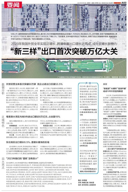 12日上午,国务院新闻办召开新闻发布会。据介绍,2023年我国货物贸易进出口总值41.76万亿元,同比增长0.2%,好于预期,实现了促稳提质目标。