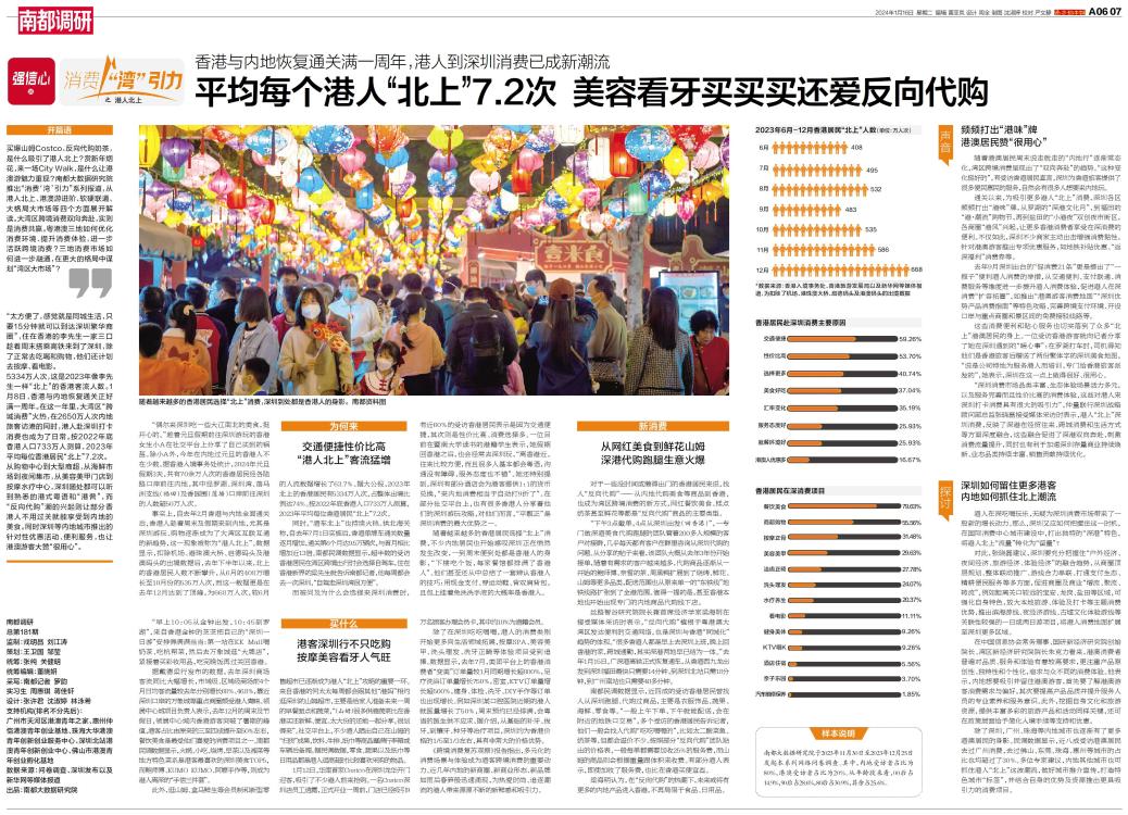 去年9月深圳出台的“促消费21条”更是提出了“一揽子”便利港人消费的举措,从交通便利、支付联通、消费服务等维度进一步提升港人消费体验,促进港人在深消费“扩容拓圈”,如推出“港澳游客消费地图”“深圳优势产品消费指南”等特色攻略、完善跨境支付环境、开设口岸与重点商圈和景区间的免费接驳线路等。