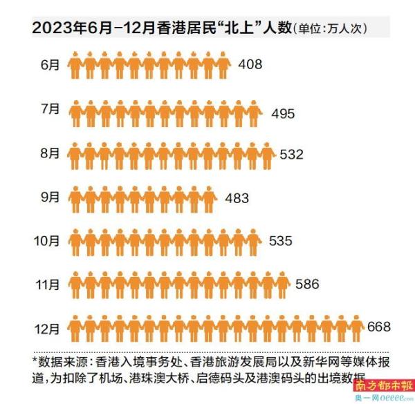 事实上,自去年2月香港与内地全面通关后,香港人趁着周末及假期来到内地,尤其是深圳游玩、购物逐渐成为了大湾区互联互通的新趋势,这一现象被称为“港人北上”。数据显示,扣除机场、港珠澳大桥、启德码头及港澳码头的出境数据后,去年下半年以来,北上的香港居民人数不断攀升,从6月的408万增长至10月份的535万人次,而这一数据更是在去年12月达到了顶峰,为668万人次,较6月的人流数据增长了63.7%。据大公报,2023年北上的香港居民有5334万人次,占整体出境比例达74%。按2022年底香港人口733万人测算,2023年平均每位香港居民“北上”7.2次。