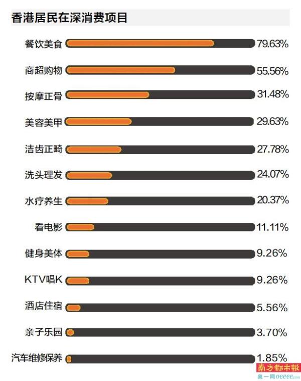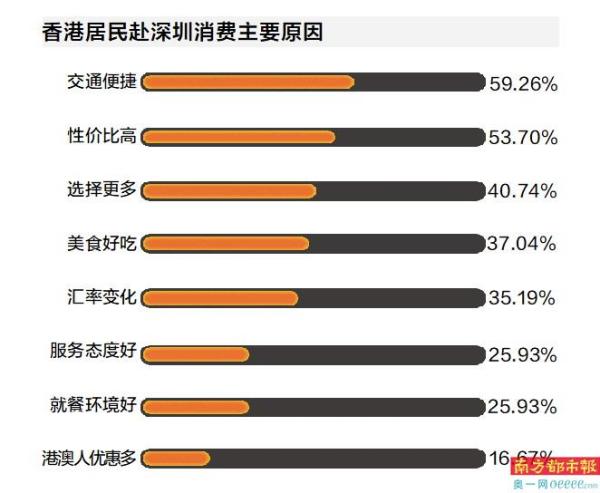 而被问及为什么会选择来深圳消费时,有近60%的受访香港居民表示是因为交通便捷,其次则是性价比高、消费选择多。一位目前在暨南大学读书的港籍学生表示,她假期回香港之后,也会经常去深圳玩,“离香港近,往来比较方便,而且很多人基本都会粤语,沟通没有障碍,服务态度也不错”。她还特别提到,深圳有部分酒店会为港客提供1:1的货币兑换,“来内地消费相当于自动打9折了”。在部分社交平台上,也有很多香港人分享着他们的深圳游玩攻略,对他们而言,“平靓正”是深圳消费的最大优势之一。