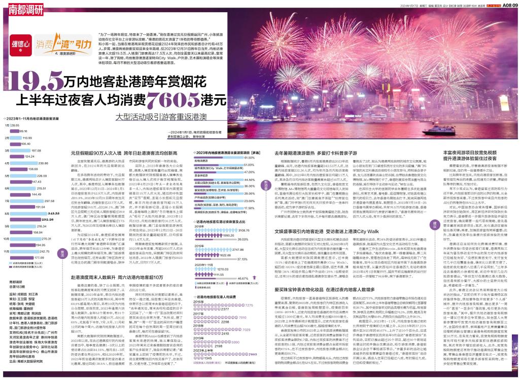 和小陈一起,当晚在维港两岸观赏烟花迎接2024年到来的市民和旅客总计约有48万人。岁尾,港澳两地旅客双双迎来全年高峰,仅2023年12月31日跨年日当天,内地访港旅客人次超19.5万,入境澳门旅客高达17.5万人次,均创全面复关以来最高纪录。复常这一年,除了购物,内地客游港澳逐渐转向City Walk、户外游、艺术展和演唱会等深度体验项目,每月不断的大型活动吸引着游客重返港澳。