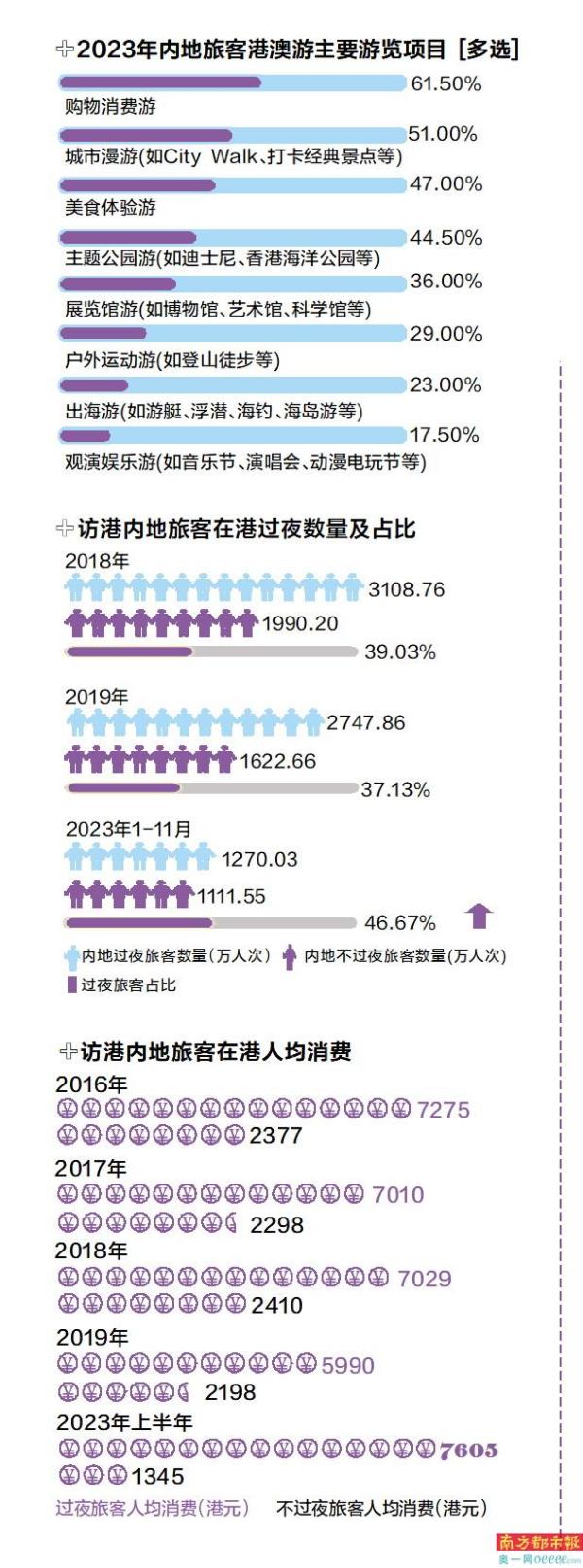 香港旅发局公布的2023年上半年旅游消费数据显示,从全部市场旅客来看,过夜旅客的消费金额是不过夜旅客消费金额的6.7倍,内地过夜旅客的消费是不过夜旅客的5.1倍。内地过夜旅客消费金额占全部市场旅客的67.5%,在不过夜旅客中,内地旅客消费金额占比更是高达88.7%。