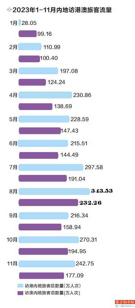 根据香港旅发局最新统计数据,从2023年全年来看,有超2650万人次访港旅客来自内地,另据澳门特区政府网站消息,2023年入境澳门旅客约2823万人次,日均7.7万人次。