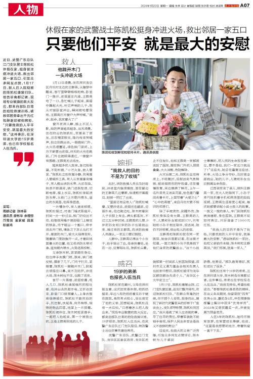 近日,武警广东总队江门支队警士陈凯松休假在家,挺身冒浓烟冲进火场,救出邻居一家五口,引发众多网友点赞。
