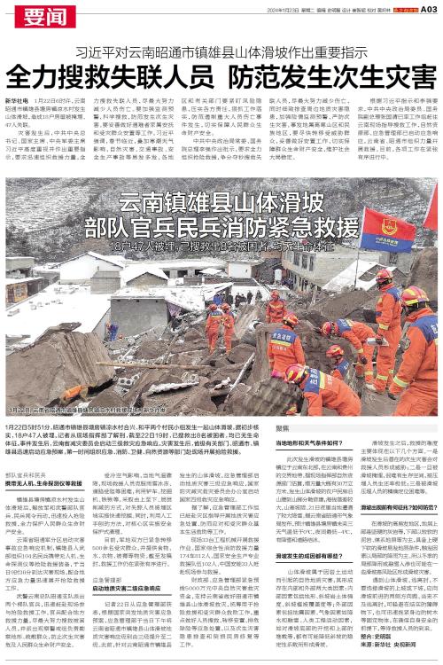 1月22日6时许,云南昭通市镇雄县塘房镇凉水村发生山体滑坡,造成18户房屋被掩埋、47人失联。