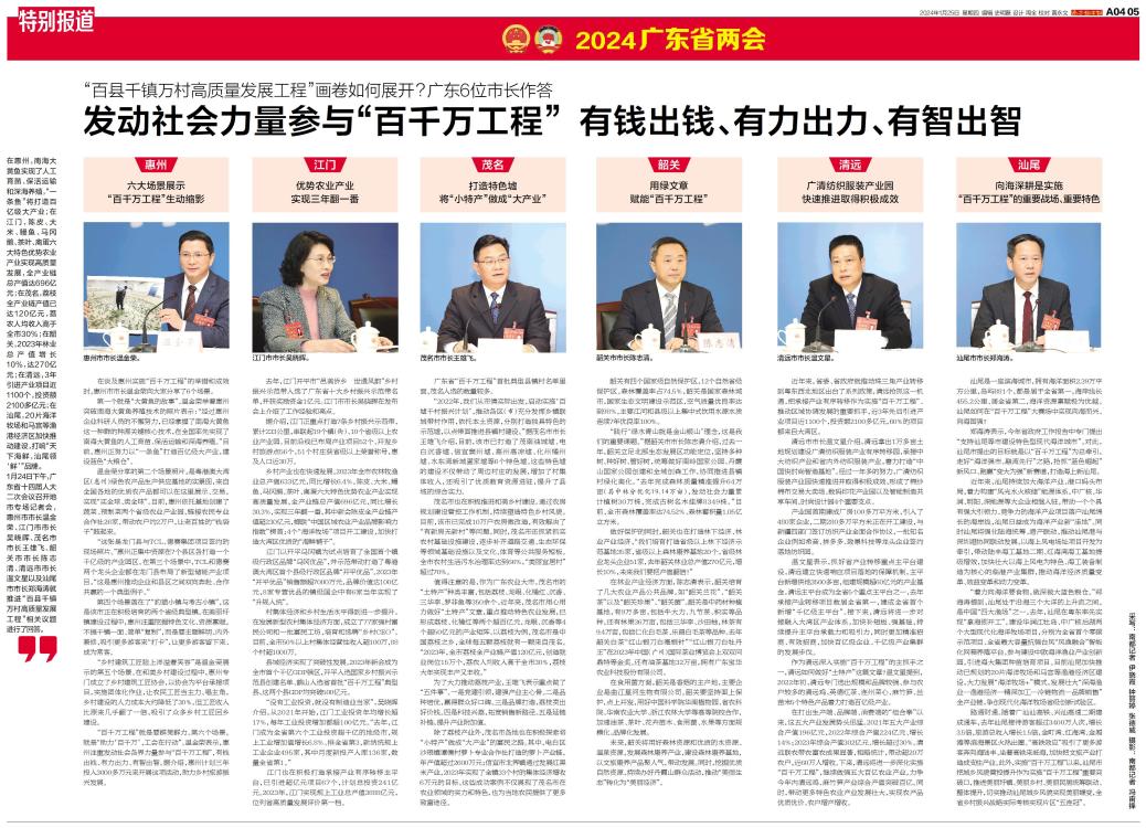 1月24日下午,广东省十四届人大二次会议召开地市专场记者会,惠州市市长温金荣、江门市市长吴晓晖、茂名市市长王雄飞、韶关市市长陈志清、清远市市长温文星以及汕尾市市长郑海涛就推进“百县千镇万村高质量发展工程”相关议题进行了回答。