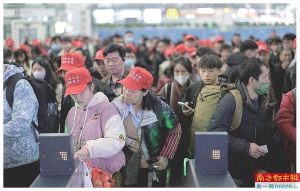 当天6:30左右,在广州南站的西进站口,头戴“小红帽”的贵州籍务工人员无疑是最亮眼的一道风景线,他们带着大包小包早早排好队,等待检票进站。