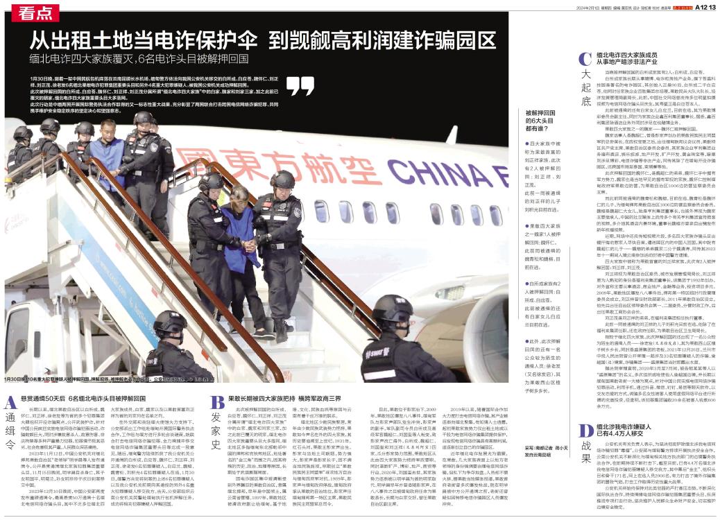 1月30日晚,缅甸警方依法向我国公安机关移交的白所成、白应苍、魏怀仁、刘正祥、刘正茂、徐老发6名缅北果敢电诈犯罪集团重要头目和另外4名重大犯罪嫌疑人,被我国公安机关成功押解回国。