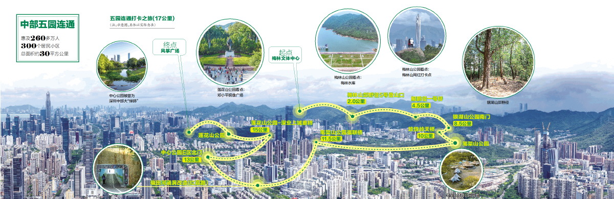 深圳沿海多山,是众多徒步爱好者的乐园。过去40多年,建立了独具特色的山海城空间格局。近些年,深圳明确提出实施“山海连城”计划,2025年贯通“一脊一带二十廊”城市生态脉络。推动生态游憩连廊建设,打造“二十个公园群”,将分散的城市公园连接成为20个互连互通的公园群。近期实现连通的深圳中部五大公园(梅林山公园、银湖山公园、笔架山公园、中心公园、莲花山公园),通过廊桥、连桥、隧道涵洞改造等方式,形成以绿色为基底、以山水为景观、以人文为特质、以街区为基础的城绿交融新格局。“五园连通”是深圳“山海连城”计划的第一步,也是福田区落实绿美广东、绿美深圳、绿美福田的重点工程。山与海相拥、人与城共融,“五园连通”连生态、连生活,为市民营造出亲自然、无边界的公共生活环境。