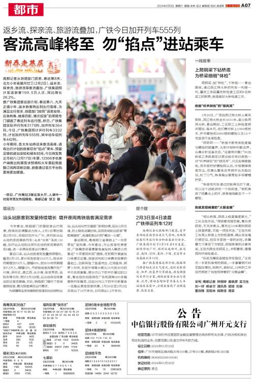 南都记者从铁路部门获悉,春运第8天,北方小年夜腊月廿三(2月2日),返乡流、探亲流、旅游流等客流叠加,广铁集团预计发送旅客199.5万人次,同比增长26.2%。